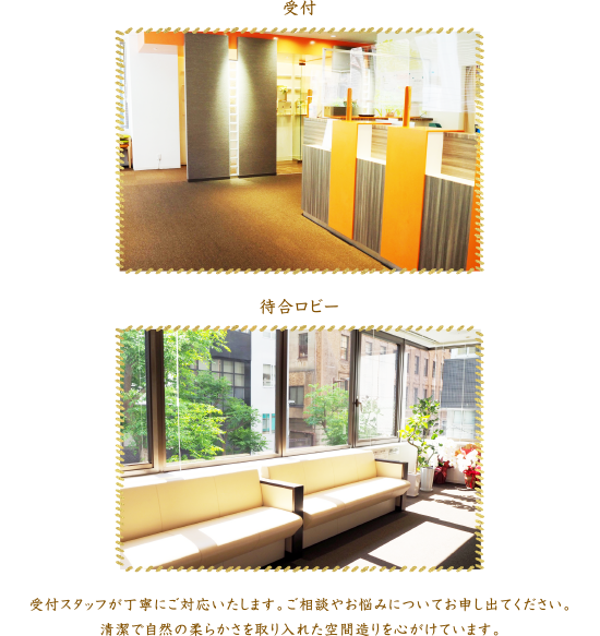 受付スタッフが丁寧にご対応いたします。ご相談やお悩みについてお申し出てください。清潔で自然の柔らかさを取り入れた空間造りを心がけています。