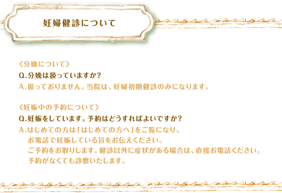 妊婦健診について 〈分娩について〉Q.分娩は扱っていますか?A.扱っておりません。当院は、妊婦初期健診のみになります。〈妊娠中の予約について〉Q.妊娠をしています。予約はどうすればよいですか?A.はじめての方は「はじめての方へ」をご覧になり、お電話で妊娠している旨をお伝えください。ご予約をお取りします。健診以外に症状がある場合は、直接お電話ください。予約がなくても診察いたします。