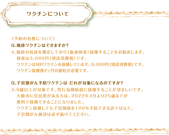 ワクチンについて 〈予約の有無について〉Q.風疹ワクチンはできますか?A.風疹の抗体を測定してから(血液検査)接種することをお勧めします。検査は3,000円(別途消費税)です。ワクチンはMRワクチンを接種しています。9,000円(別途消費税)です。ワクチン接種後2ヶ月の避妊が必要です。Q.子宮頚がん予防ワクチンは だれが対象になるのですか?A.9歳以上が対象です。性行為開始前に接種することが望ましいです。大阪市に住民票がある方は、2022年4月より25歳までが無料で接種できることになりました。ワクチン接種しても子宮頸癌を100%予防できる訳ではなく、子宮頸がん検診は必ず続けてください。