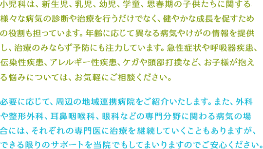 小児科は、新生児、乳児、幼児、学童、思春期の子供たちに関する様々な病気の診断や治療を行うだけでなく、健やかな成長を促すための役割も担っています。年齢に応じて異なる病気やけがの情報を提供し、治療のみならず予防にも注力しています。急性症状や呼吸器疾患、伝染性疾患、アレルギー性疾患、ケガや頭部打撲など、お子様が抱える悩みについては、お気軽にご相談ください。必要に応じて、周辺の地域連携病院をご紹介いたします。また、外科や整形外科、耳鼻咽喉科、眼科などの専門分野に関わる病気の場合には、それぞれの専門医に治療を継続していくこともありますが、できる限りのサポートを当院でもしてまいりますのでご安心ください。
