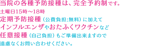 当院の各種予防接種は、完全予約制です。土曜日15時~18時定期予防接種(公費負担:無料)に加えてインフルエンザやおたふくワクチンなど任意接種(自己負担)もご準備出来ますので遠慮なくお問い合わせください。