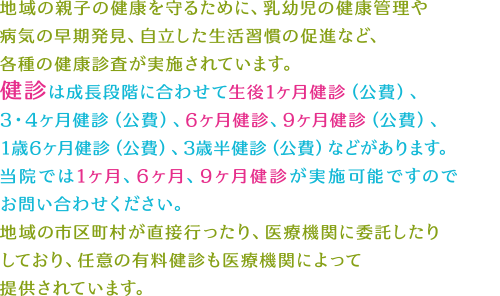 地域の親子の健康を守るために、乳幼児の健康管理や病気の早期発見、自立した生活習慣の促進など、各種の健康診査が実施されています。健診は成長段階に合わせて生後1ヶ月健診(公費)、3・4ヶ月健診(公費)、6ヶ月健診、9ヶ月健診(公費)、1歳6ヶ月健診(公費)、3歳半健診(公費)などがあります。当院では1ヶ月、6ヶ月、9ヶ月健診が実施可能ですのでお問い合わせください。地域の市区町村が直接行ったり、医療機関に委託したりしており、任意の有料健診も医療機関によって提供されています。