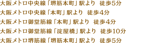 大阪メトロ中央線「堺筋本町」駅より 徒歩5分 大阪メトロ中央線「本町」駅より 徒歩4分 大阪メトロ御堂筋線「本町」駅より 徒歩4分 大阪メトロ御堂筋線「淀屋橋」駅より 徒歩10分 大阪メトロ堺筋線「堺筋本町」駅より 徒歩5分
