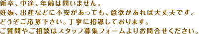 職種 正看護師 医療事務 勤務形態 常勤 パート 勤務開始可能日 月 日 お名前(漢字) お名前(ひらがな) 電話番号・携帯番号 - - メールアドレス ※受信可能なメールアドレスをご入力ください。 メールアドレス(確認用) ※確認のためもう一度メールアドレスをご入力ください。 その他お問合せ 応募理由や自己アピール、質問事項をご記入ください。 フォームによる個人情報取り扱いについて スタッフ募集業務に必要な、氏名・メールアドレスなどの個人情報の入力を必須とさせていただいております。 ご提供いただいた個人情報は、当院のスタッフ募集業務にのみ使用し、その他の目的には一切使用いたしません。 また、個人情報を当院から第三者に提供することも一切いたしません。 個人情報取り扱いについての同意 ご同意いただける場合は、「同意する」にチェックし、「送信」ボタンを押してください。応募フォームご送信後、診療時間内にTEL: 06-4708-7156までご連絡ください。